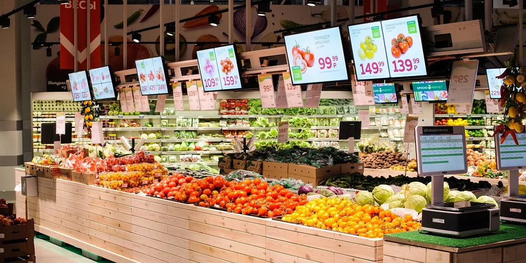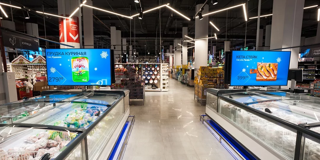 Светодиодные экраны с российским программным обеспечением SmartPlayer, установленные над стеллажами с товарами, позволяют централизованно обновлять динамический контент и своевременно менять информацию о ценах.