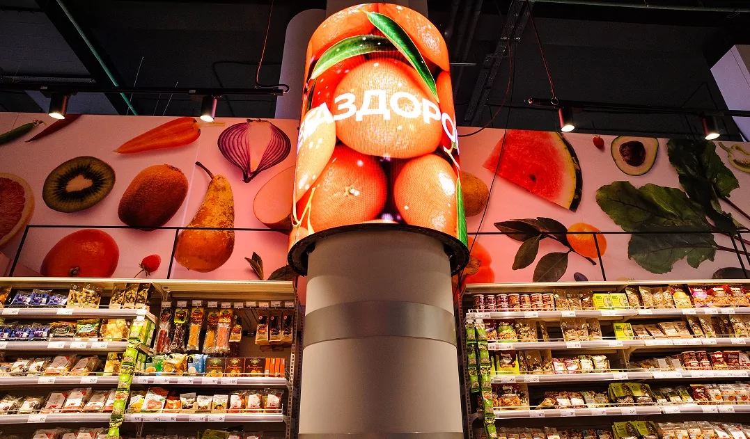 Для оформления интерьера магазина в ярком инновационном формате суперстора были использованы бесшовные гибкие LED-экраны с шагом P3.
