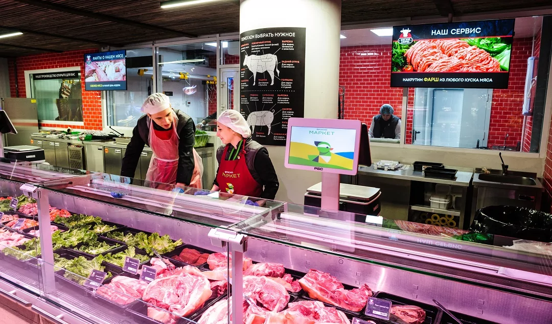 В зонах продаж свежего мяса и рыбы установлены дисплеи Samsung, которые информируют о дополнительном сервисе к этим продуктам.