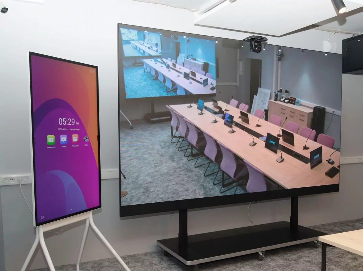 Устройства отображения представлены светодиодным экраном All-in-One QSTech 138” серии MWall. Данный экран характеризуется использованием технологии SMD 3в1 GOB с шагом пикселя 1.588, яркостью до 550 кд/м², контрастностью 6500:1 и поддержкой разрешения FHD. Особенностью MWall является удобство инсталляции и размещение в помещении за счет компактного формата трансформации со створками. Моторизированная подставка позволяет отрегулировать высоту экрана до комфортного уровня использования.
