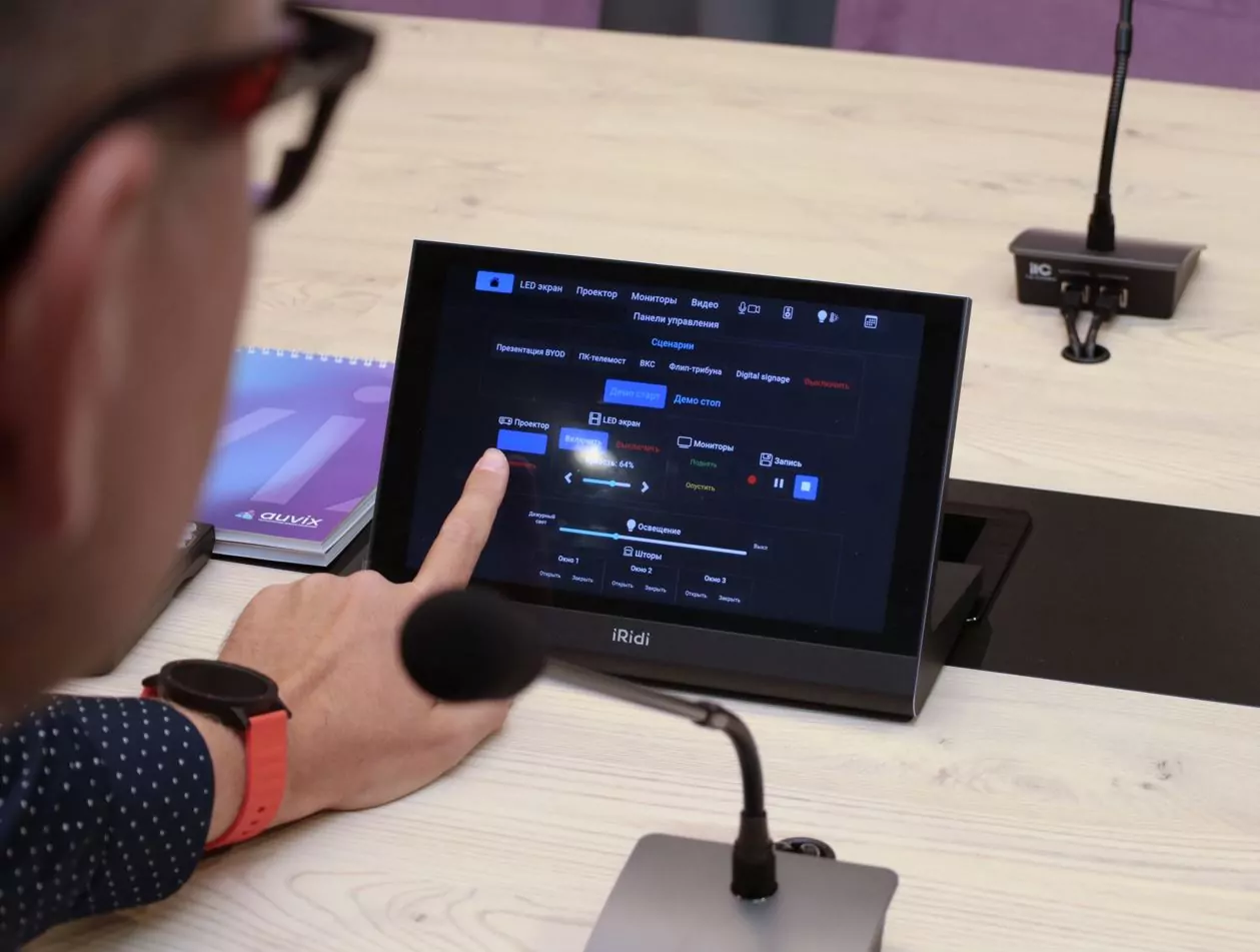 Для управления мультимедийным комплексом без ежедневного привлечения инженерных ресурсов была внедрена систему управления и автоматизации отечественного производителя iRidi из реестра радиоэлектронной продукции Минпромторга РФ. За основу был взят ProAV процессор управления PX-VP100-Advanced. Он обеспечивает централизованное управление всем оборудованием инсталляции преимущественно по Ethernet, а также через встроенные порты RS-232, RS-485 и IR. За автоматизацию, которая включает в себя управление светом, приводами штор и системой климат-контроля, отвечает оборудование iRidi bus77 Pro, представленное в виде реле, диммеров, DALI шлюзов и универсальных входов. Оперативность инсталляции была обеспечена использованием Driver Hack, который разработали и внедрили специалисты компании AUVIX. Конечный пользователь переговорного пространства получил удобный и логичный центр управления всеми подсистемами в виде стильной и функциональной настольной панели iRidi P10-T диагональю 10”. Чтобы провести мероприятие с привлечением всего мультимедийного функционала достаточно одного касания на планшете. Если же требуется изменить источники сигналов, раскладку отображения, то легкость этих манипуляций удивит многих. Все визуализировано и структурировано на профильных вкладках интерфейса.