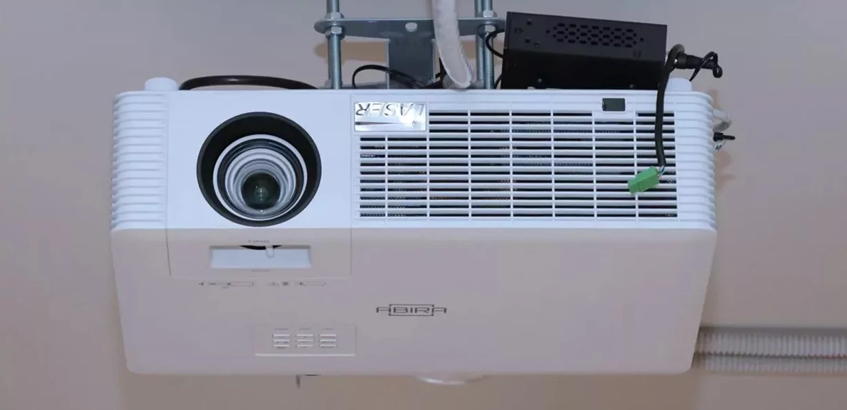 В левой части зала установлен лазерный (NICHIA Laser) проектор Abira AB-LH650 на основе DLP –технологии cразрешением Full HD, яркостью в 6500 lm/6000 lm (ANSI) и контрастностью 5000000:1. Проекция осуществляется на моторизированный экран Lumien LMC-100116 и размером до 131” (соотношение сторон 16:9).