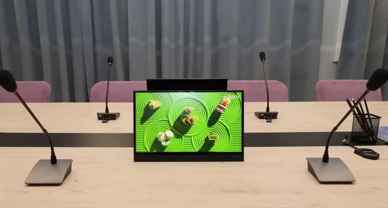 На технологически выверенном столе можно познакомиться с оперативностью появления сверхтонких моторизированных мониторов Wize Pro WR-15GS. Их технические характеристики высоко оценят заказчики, для которых важна премиальная эстетика: диагональ 15,6", фиксированный наклон 15°, лифтовая часть полностью скрытая под столешницей, отсутствие видимой панели. Всего в проекте использовано 7 мониторов.