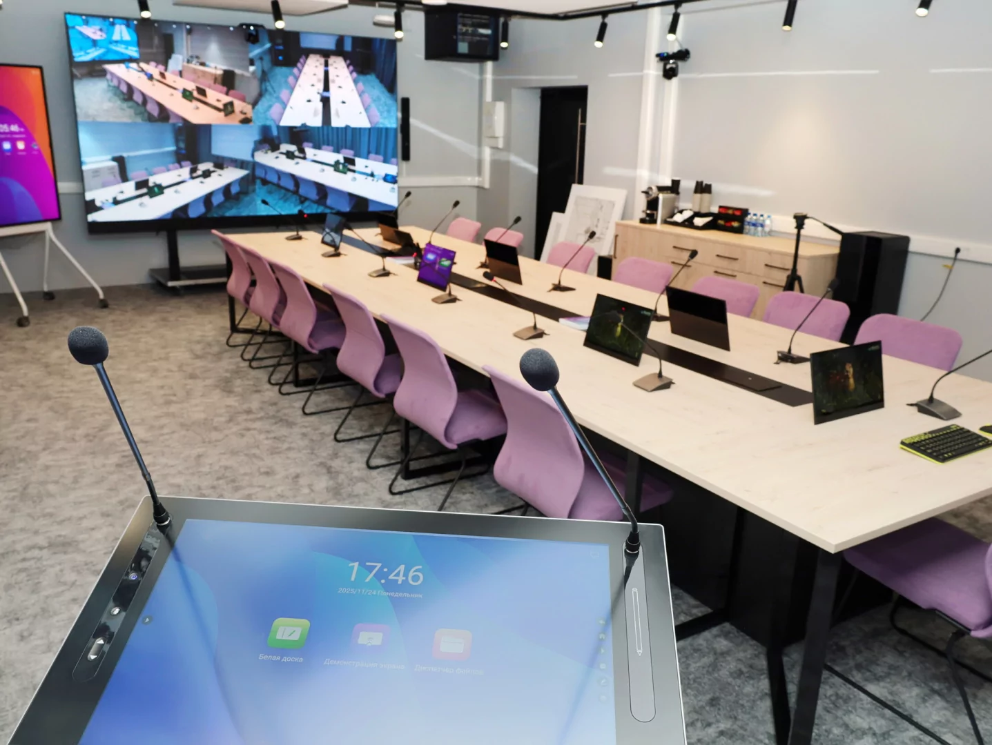 Для взаимодействие с гостями предусмотрен универсальный донгл от Infobit (iShare X400), который обеспечивает беспроводное подключение в одно движение к устройствам отображения. С помощью iShare X400 партнеры могут начать гибридную встречу со своего ноутбука, телефона или планшета, используя любое программное обеспечение для проведения конференций.