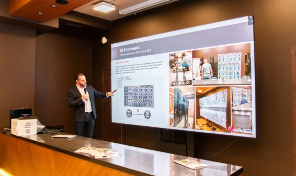LED-экран LG LAEС015 представляет собой готовое решение «все-в-одном», имеет шаг пикселя 1,5, яркость 500 НИТ и разрешение Full HD. Он оснащен встроенным контроллером с интуитивно-понятным интерфейсом LG Web OS и акустической системой, подходящей для озвучивания небольшого помещения. Для подключения к различным цифровым источникам предлагается широкий набор интерфейсов, включая HDMI, DisplayPort, USB 2.0. Интегрированное ПО LG SuperSign CMS обладает расширенными возможностями по управлению мультимедийным видеоконтентом. Также экран совместим с решением для беспроводной демонстрации LG One: Quick Share. Отсутствие видимых швов позволяет воспроизвести визуально-целостный контент, что особенно важно при отображении графиков, диаграмм и таблиц.