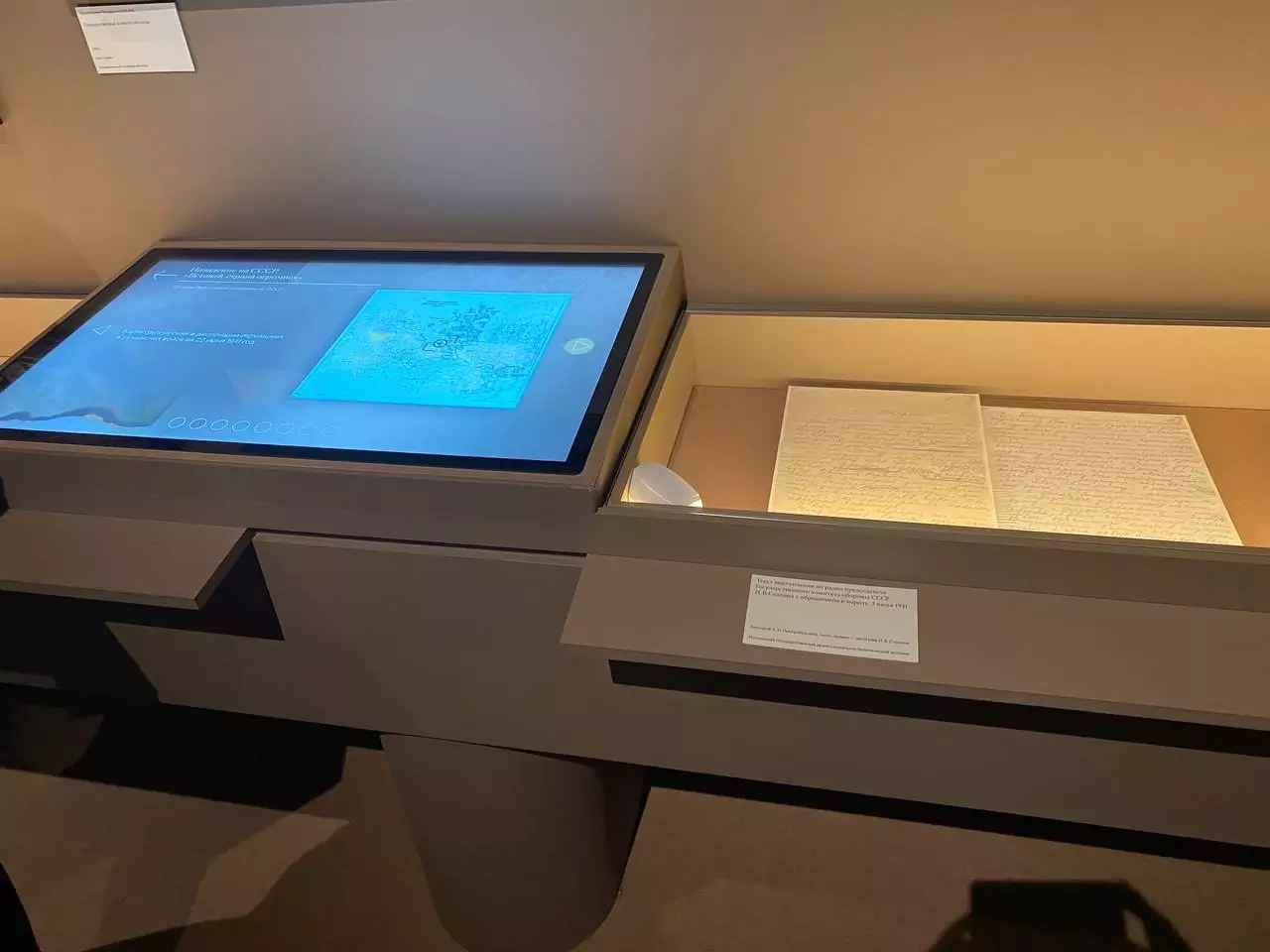 Перед создателями экспозиции стояла задача, сделать так, чтобы новые технологии помогали понять экспонаты, но не перетягивали внимание на себя, гармонично вписать интерактивные элементы — пояснения и дополнения к экспонатам — и при этом не отвлекать внимание от самих подлинников. Для решения этой задачи в каждом из 10 залов появились информационные поверхности, на основе безрамочных сенсорных панелей Lumien, встроенные в витрины, рядом с музейными предметами и документами. Небольшой угол наклона дисплеев обеспечил удобство для чтения и минимизировал блики от световых приборов.