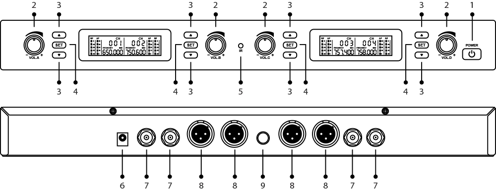 • Разъемы приемника: XLR - 4 шт., Jack TS, 6.35 мм – 1 шт.