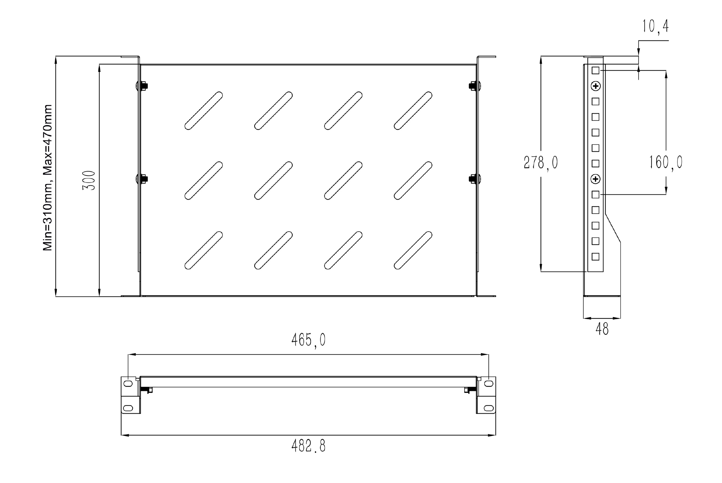 Полка стационарная WSH1U с боковым креплением для установки в рэковый шкаф 19", высота 1U, глубина 600 мм, перфорированная.