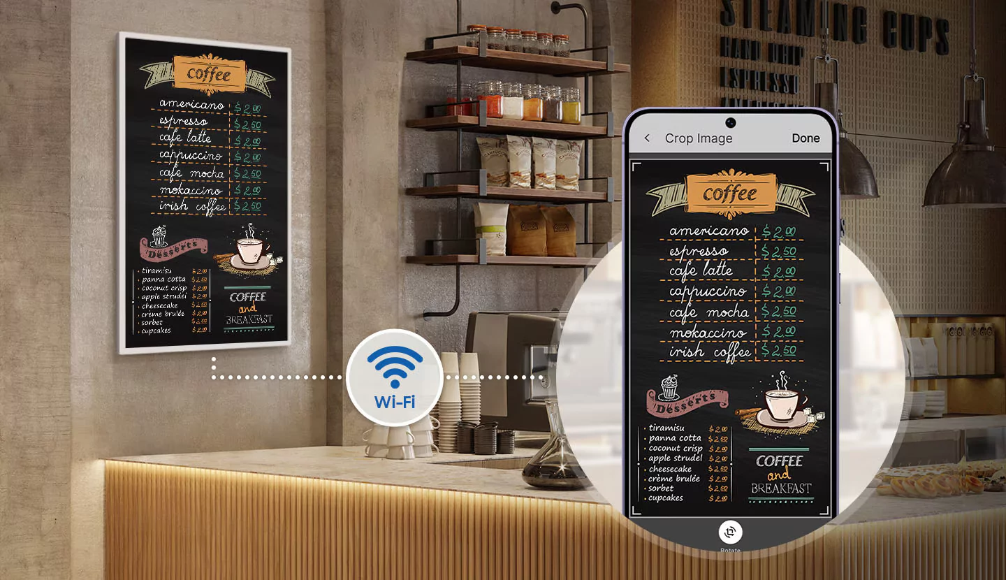 Специальное приложение Samsung E-Paper, доступное на мобильных устройствах Android и iOS, позволяет пользователям локально управлять дисплеями EM32DX. Это приложение предлагает комплексное управление устройствами - от простого сопряжения и настроек до создания контента и быстрого обновления.