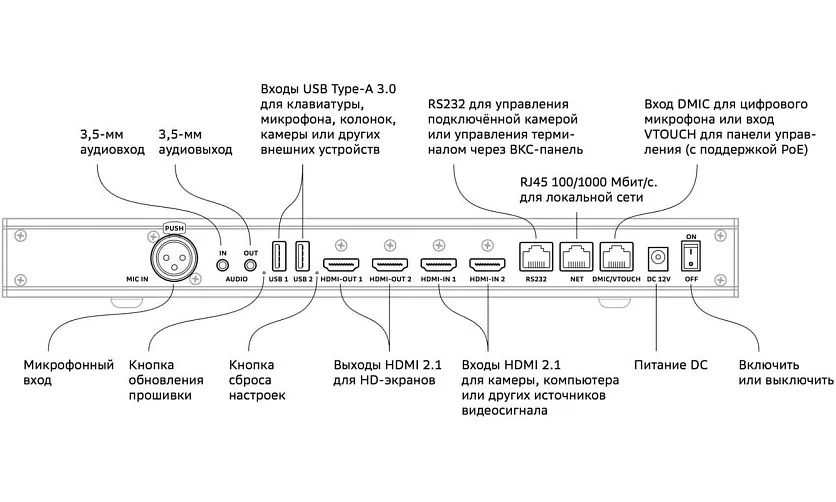 Терминал может использоваться для оборудования переговорной комнаты как в производственной, так и в непроизводственной сфере экономической деятельности. Устройство не предназначено для использования в личных целях и для решения задач, не связанных с деятельностью организации-приобретателя терминала.